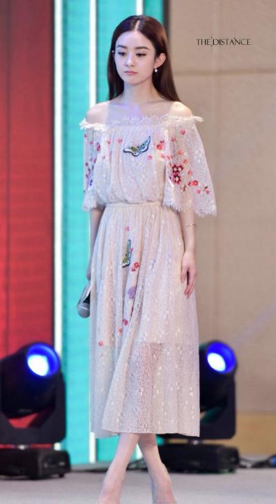 赵丽颖一字肩蕾丝裙仿若花仙子